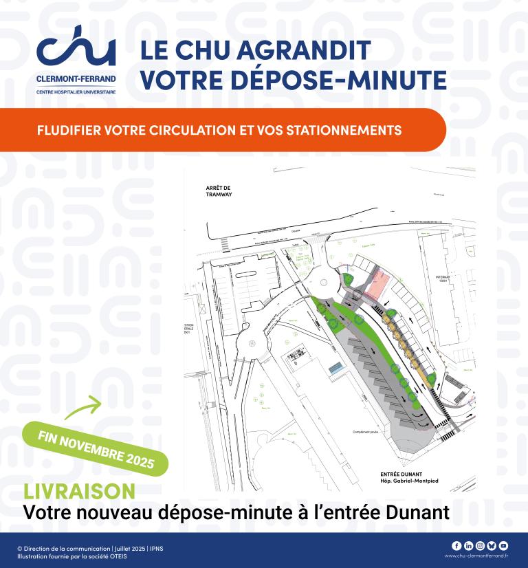 L'hôpital Gabriel-Montpied réaménage son entrée Dunant (nord - côté tramway) pour fluidifier la circulation et les stationnements des déposes-minutes des professionnels du transport sanitaire et offrir un service public qualitatif pour l'acheminement des patients jusqu'au CHU.